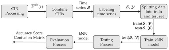 For this classification task, a kNN method is implemented. The classification is computed from a majority vote of the k-nearest neighbors for each measured CIR following a defined distance metric. The model is trained by saving examples for each scene from a labeled training dataset. This approach is similar to previously investigated kNN applications—e.g., [], where measured CIRs were assigned to a location based on fingerprinting. However, in this work, the kNN classification is not used to directly perform a localization but rather to classify the observed state. The derived kNN algorithm and its processing steps to obtain the detection state of the scene are outlined in Figure 9.