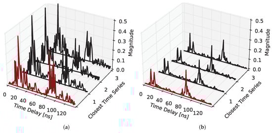 To fit the classifier to the training data, the measured time series of each dataset are split into a test and training data subset with a defined size. The number k of nearest neighbors is configurable as a parameter of the classifier and controls the number of nearest neighbors used for assigning the class in the testing stage. Figure 10 shows two examples of a combined CIR time series from the test dataset (red) as well as the four nearest neighbors from the training dataset.