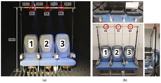 Measurements are carried out in a radio frequency anechoic chamber (Figure 11a) under near-ideal conditions, as well as in an aircraft seat mockup in a laboratory environment (Figure 11b). Due to its inherent properties, the anechoic chamber eliminates propagation effects caused by the environment; e.g., by walls, the floor or the ceiling. Instead, only the desired target objects influence the signal propagation and generate multipath components. In addition, a more complex scenario is provided in the lab mockup, as additional reflection sources are not blocked out.