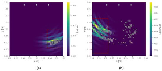 Grid-based mapping and detection: (a) mapping with Table 3 in use (dataset I) and (b) mapping with seat 1 occupied (dataset IV). Estimated positions for all observation steps (grey crosses), sensor position (grey dots) and detection area (red). In addition, the probability map is displayed, including the Likelihood result of the last observation step.