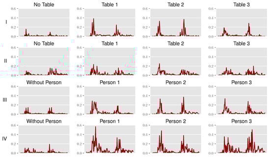 In order to further evaluate the performance of the kNN classification, the confusion matrix of each use case and environment is computed. For this, the confusion matrix of datasets I, II and III in Figure 14 compares the actual detected scene with the kNN-predicted scenes. The values correspond to the relative number of actual or predicted classes in relation to the size of the testing dataset. For datasets I, III and IV, a prediction accuracy has been achieved. Solely in II, some scenes are predicted incorrectly. This evaluation is based on this configuration: a test set size of for each dataset, and the Euclidean metric. This is discussed further later in this work.
