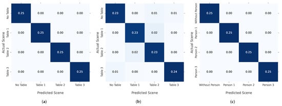 Confusion matrix for the classification: (a) table detection in the anechoic chamber (I a); (b) table detection in the lab mockup (II a); (c) seat occupancy detection in the anechoic chamber (III).