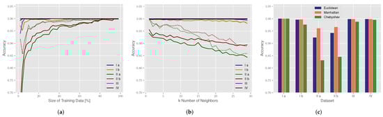 By default, the training size is set to , , and the Euclidean distance is used. The correlation between the size of the training dataset and the accuracy is shown in Figure 15a and indicates that a higher percentage of training data will increase the accuracy.