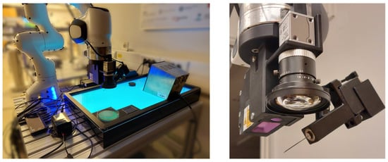 The experimental setup consisted of robot manipulator Panda (Franka Emika, GmbH, Munich, Germany), mass spectrometer MALDI Biotyper (Bruker, Inc., Billerica, MA, USA), a thermal sterilizer SteriMax smart (WLD-TEC, GmbH, Arenshausen, Germany), and disposable MALDI target plates MBT Biotarget 96 (Bruker, Inc.). The end-effector tool attached to the robot manipulator consisted of an RGB camera a2A3840-45ucPRO (Basler, GmbH, Ahrensburg, Germany), a 2D laser profile measurement system ZG2-WDS8T (Omron Industrial Automation, Inc., Hoffman Estates, IL, USA), force sensor Nano17 (ATI Industrial Automation, Inc., Apex, NV, USA), a feedback 360° high-speed servo motor (Parallax, Inc., Rocklin, CA, USA), and a stainless steel needle (Figure 1).