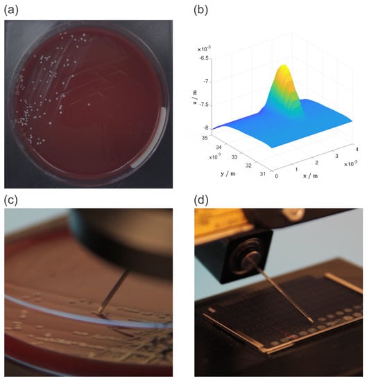 The Panda robot was used as a manipulator while also serving as an input device during kinesthetic teaching. Using both the RGB camera and the 2D laser profile measurement system, we detected the bacterial colony and determined its position with sub-millimetre accuracy. The RGB camera acquired an image of the Petri dish (Figure 2a), based on which the operator could determine an approximate position of the selected bacterial colony. The area around the approximate position was then scanned with the 2D laser profile measurement system, which provided the operator with a detailed 3D model of the area (Figure 2b), including the bacterial colony. The scan area dimension was 8 × 4 mm. The 2D laser profile measurement system resolution is 13 m in x direction and 1 m in z direction. Defined by the robot movement, the generated 3D model resolution in y direction was 40 m. The generated 3D model provided the operator with the colony’s exact position. The colonies were picked and deposited using a stainless steel needle (Figure 2c). For the picked colonies to be analyzed with MALDI Biotyper mass spectrometer, they first had to be deposited on MBT Biotarget 96 target plates (Figure 2d). However, the contact forces were significant due to the target plate’s stiffness. Therefore a force sensor was used to adjust the deposition trajectory in a vertical direction based on the measured forces. For successful deposition, it was also necessary to rotate the needle. This was achieved by using a 360° servo motor with position feedback. The position feedback was necessary for an accurate picking of bacterial colonies. After each colony deposition, the needle was sterilized using 96% denatured ethyl alcohol and a thermal sterilizer SteriMax smart.