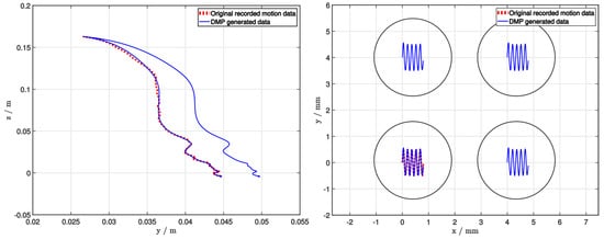 Using DMP to generalize demonstrated trajectories of the picking (left) and deposition (right) task. In order to demonstrate the quality of generalization, the end position of the picking process is modified, whereas both the start and end position are modified for the deposition process.