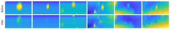 In order to evaluate the picking process, we acquired multiple colony 3D models before and after the picking process. We plotted these models using a top-down heatmap (Figure 4). While each pixel position represents a different coordinate on a 3D model’s x-y plane with the dimensions of 8 mm × 4 mm, its color represents the 3D model’s z value in each coordinate. The color changes from blue to yellow depending on the z value, where deep blue depicts the lowest z values, and bright yellow depicts the highest z values. We omitted color legends that would provide exact z values to increase the figure’s clarity. We believe the absolute z values, in this case, are not so relevant since we are more interested in the overall change in shape. However, as a reference, the colony, which was by far the biggest and much bigger than the rest (Figure 4, top–left), had maximum dimensions of 1.7 × 2.1 × 0.5 mm.