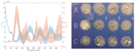 Regarding the deposition process, we can see from the plot (Figure 5, left) that the force compensation works well. Throughout the process, the z position is actively compensated. Smaller contact forces allowed better deposition and prevented the damaging of equipment. During the initial contact, the contact force exceeds 1 N but is consistently compensated so that the mean force after the initial contact is approximately 0.3 N. However, if we look at the image of the deposited colonies (Figure 5, right), we can see that although the samples are all within their designated spots, they are deposited differently. Most are distributed uniformly over the whole spot, while some remain concentrated in smaller areas. The concentrated areas are not desirable since they can cause poorer identification results. However, after a visual analysis, we could not determine the features that could reliably predict poor identification results. For example, samples A1 and A2 achieved excellent identification scores with their samples being uniformly distributed, while at the same time, sample A4 was not identified, although it achieved similar levels of uniformity. On the other hand, samples C3 and C4 obtained excellent scores without achieving similar levels of uniformity as A1 and A2. That means that additional factors besides the sample distribution might influence the final identification process. Since the deposition process was consistent (e.g., movement trajectory, forces), the variation in deposition quality can be partially attributed to the physical structure of colonies and their placement on the picking needle. We mitigated the second issue by modifying the shape of the deposition trajectory and rotating the needle around its axis throughout the deposition process. We modified the deposition trajectory by defining it programmatically instead of using a human demonstration. During the testing, demonstrations were used to define the deposition trajectory as well. However, since the deposition process was unreliable, we decided to use a well-defined trajectory in order to reduce the number of potential influences on the quality of deposition. This trajectory was then used also during the main experiment. Although a pre-programmed trajectory was used as a demonstration, DMP still proved to be an appropriate method to generalize a movement since it adapted the taught movement to different start and end positions.