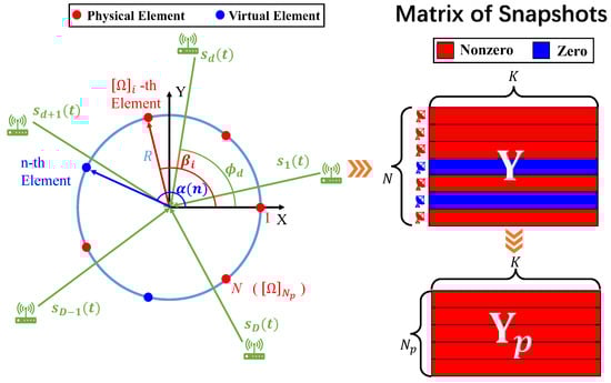 As shown in Figure 1, we consider an SCA that is composed of physical sensors selected from a N-element UCA with radius R. The n-th angle coordinate of the element located on the UCA is given by: