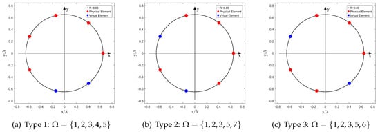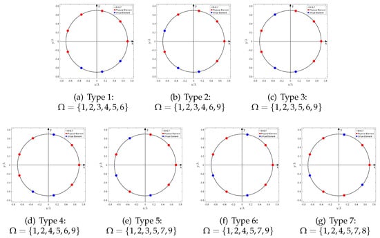Apparently, when sensor failure occurs, the locations of the faulty sensors are random. Considering the circular symmetry, there are three different array configurations when and ; and the number of different array configurations is seven when and . We have plotted these arrays in Figure 3 and Figure 4, respectively.