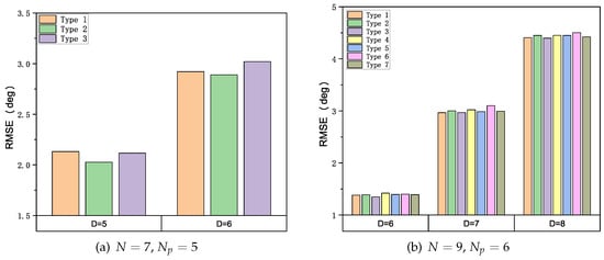We perform the following simulations to evaluate the performance of the GSCA algorithm under different array configurations when the SNR and the number of snapshots K are fixed at a moderate value (SNR = 15 dB, K = 1024). The number of sources D is an integer variable selected from to satisfy the underdetermined scenario. The simulation results are shown in Figure 5a and Figure 5b, respectively. Obviously, when the simulation parameters {SNR} are the same, the RMSEs of different array configurations are almost at the same level, which means the robustness of our method to various array configurations with the same N and . Therefore, in the following simulations, we selected one type of array from each group to study the effects of SNR and K.