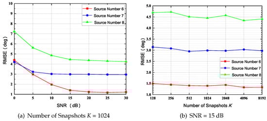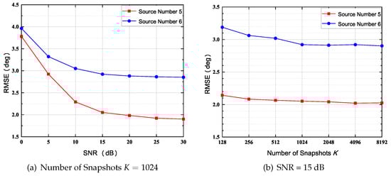 The RMSE versus SNR and number of snapshots K are plotted in Figure 6, respectively. As shown in Figure 6a, the RMSE is gradually dropping as the SNR increases; yet the RMSE is slightly dropping as K increases. In addition, the RMSE increases as the number of sources D increases when the SNR and K are fixed (Figure 6b).