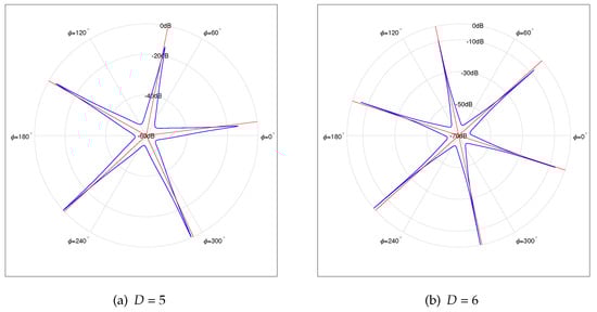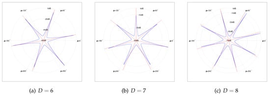 In this simulation, we study the performance of DOA estimation versus SNR and K. The number of sensors in UCA: N is set to 7, and the number of physical sensors is set to 5 with label (Type 2 in Figure 3). A schematic of this SCA is shown in Figure 3b. The normalized radius is set to 0.65, in this case, is 7 based on (14). Notably, the source number D is set to 5 and 6 in order to perform underdetermined DOA estimation, and DOAs are set to be equidistantly distributed in [34].