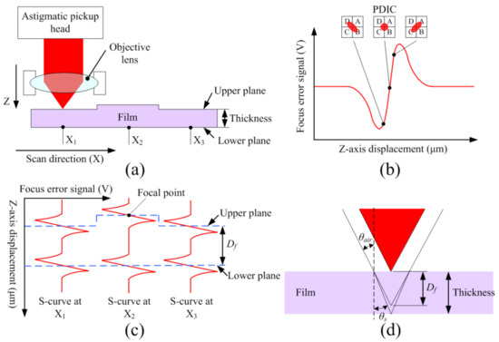 Figure 1a illustrates the proposed method for the measurement of the thickness of transparent films. A laser from an astigmatic pickup head is focused on a sample surface, and the laser reflection is received by a photodetector integrated chip (PDIC). The PDIC consists of four quadrant photosensors (A, B, C, D), which generate voltage signals (SA, SB, SC and SD) through an amplifier circuit. Due to the astigmatic effect of the pickup head, the z-axis displacement of the sample causes shape variation of the laser spot on the PDIC. This shape variation can be detected by a focus error signal (FES) defined as (SA + SC) − (SB + SD). The relation between the FES and z-axis displacement between the pickup head and sample creates an S-curve feature around the laser’s focal position as illustrated in Figure 1b. In common profilometer mode, the vertical position of the pickup head is adjusted to position the FES within the linear region of the S-curve; the FES can then represent the surface profile as the laser scans the surface. In the thickness measurement mode, the objective lens or the measured sample is moved vertically to obtain the FES—z-axis displacement curve for each image pixel, as shown in Figure 1c. Two S-curve features are generated by the laser reflection from the upper and lower planes. Through the calculation of the z-axis positions of the upper and lower focal points, the upper and lower surface profiles can be obtained, as indicated in Figure 1c. Moreover, the vertical displacement Df between upper and lower focal points can also be calculated. To obtain the film thickness, the refraction effect in the film sample needs to be considered, as illustrated in Figure 1d. The film thickness can be calculated as in (1):