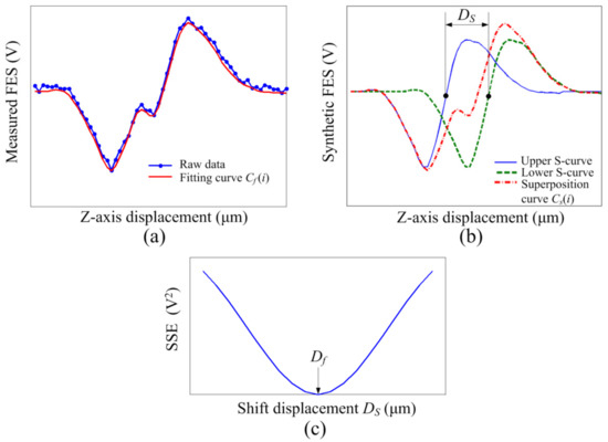 One limitation of film thickness measurement is the coupling of the upper and lower S-curves, which occurs for films <25 μm thick according to the S-curve range of the DVD pickup head. In this study, we proposed a decoupling method for our astigmatic optical profilometer. Figure 2a shows an FES—z-axis displacement curve exhibiting the aforementioned coupling problem. In our method, a fitting curve Cf(i) based on raw data is calculated to obtain an FES for an arbitrary z-axis displacement and eliminate noise. The Cf(i) was synthesized by eight sinusoidal functions using Matlab software. A pure S-curve feature without the coupling issue is required; this can be obtained by measuring a thicker film composed of the same material. Through the generation of two S-curves with a displacement shift Ds, a synthetic FES—z-axis displacement curve Cs(i) can be calculated according to the superposition principle, as illustrated in Figure 2b. Subsequently, the sum of squared error (SSE) at different Ds can be calculated as in (4):