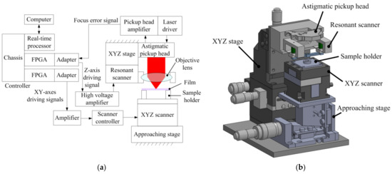 We used the previously designed astigmatic optical profilometer featuring a resonant scanner for high-speed z-axis modulation [28]. The system configuration and mechanical design of the astigmatic optical profilometer are presented in Figure 3a,b, respectively. To measure the S-curve for each image pixel, the resonant scanner contains the objective lens of an astigmatic pickup head (TOP1100s, TopRay Technologies, Hsinchu, Taiwan) and performs vertical sinusoidal movements. The resonant scanner has a resonant frequency of 1.6 kHz and a travel range of >87 μm. A film sample is placed on a tubular sample holder to avoid light reflected by the holder’s surface. An XYZ stage (XC2-60SMW and ZA-60MBW, Tsukumo Engineering, Sayama, Japan) is used to move the pickup head into its measuring range and to adjust its position. The FES generated from a customized amplifier (high-speed TopRay driver v122, Strømlinet Nano) is acquired by a programmable controller (PXIe system, National Instruments, Austin, TX, USA) equipped with a chassis (PXIe-1062Q), a real-time controller (PXIe-8840), and two field-programmable gate array modules (FPGAs) (PXIe-7961R) with adaptors (NI-5781). The controller directs the vertical movement of the resonant scanner and the XY scanning of a closed-loop XYZ piezoelectric scanner (P-611.3S NanoCube, Physik Instrumente, Karlsruhe, Germany) through a high-voltage amplifier (PD200, PiezoDrive) and a scanner controller (E-664.S3 Piezo Controller, Physik Instrumente, Karlsruhe, Germany), respectively. The z-axis displacement of the XYZ scanner has a range of 100 μm, which can also be used for single-point thickness measurement. For 3D imaging, the resonant scanner is essential for reducing measurement time.