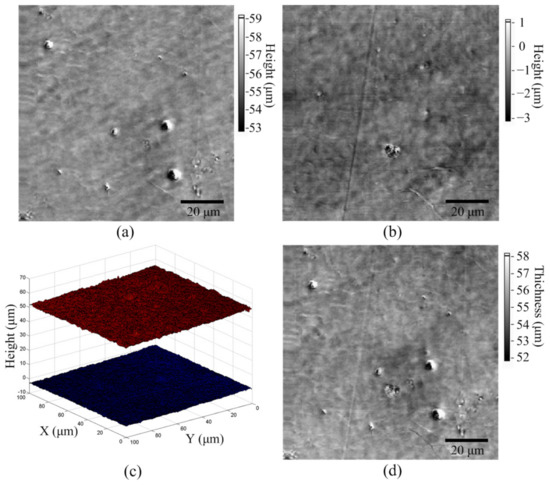 Various methods, including stylus profilometry, atomic force microscopy (AFM), interferometry, and ellipsometry, have been utilized to measure film thickness [12,13,14]. By using a sharp probe to scan a measured surface, contact-based methods, including stylus profilometry and AFM, can provide high-resolution images that can identify membranes only a single atom thick on a substrate [15]. In these methods, the probe must contact both the film and substrate surface to measure the film’s thickness. Therefore, a major limitation of contact methods is that the associated substrate must be at least partially exposed. By contrast, noncontact methods are usually based on optical principles and are often more expedient than contact methods are. Moreover, noncontact methods avoid the damage to the sample that results from the interaction force between the sample and probe, as occurs with contact methods. The appropriate measurement method depends on the requirements of the application [16]. For instance, spectroscopic ellipsometry (SE) is commonly used for measuring transparent films with thicknesses ranging from nanometers to tens of micrometers [17,18,19]. However, model-based SE thickness calculations require precise modeling and parameter selection to obtain accurate results [20,21,22].