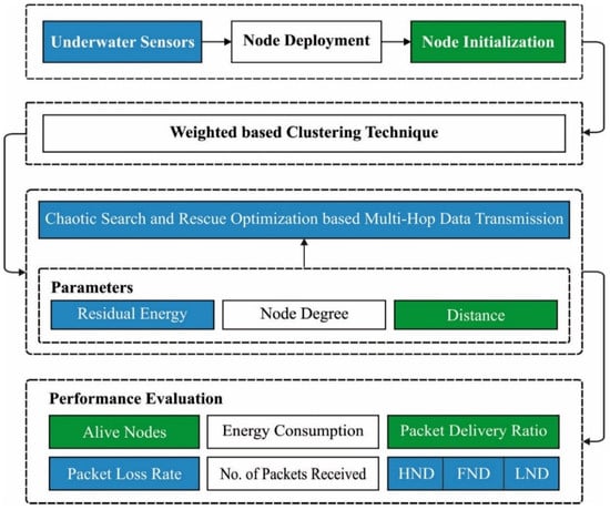 In this study, a novel CSRO-MHDT method was developed for the optimal choice of routes for data transmission in a UWSN. Clustering is a well-known energy-saving strategy in sensor networks. The least-cost-clustering steering procedure (MCCP) is one of the clustering-based routing protocols (UWSNs). This parameter is composed of three important values: the total energy consumed by member nodes during data transfer to the CH, the total energy residual on the bunch head node and its associate bulges, and the distance between the cluster head node and the originating base station. The major intention of the CSRO-MHDT technique is to the reduce energy dissipation and enhance the lifetime of a UWSN. Primarily, the CSRO-MHDT technique involves WCA for the effectual choice of CHs. In addition, the CSRO-MHDT technique derives a fitness function and can effectually select the set of routes in a UWSN. Figure 1 presents the general procedure of the CSRO-MHDT method.