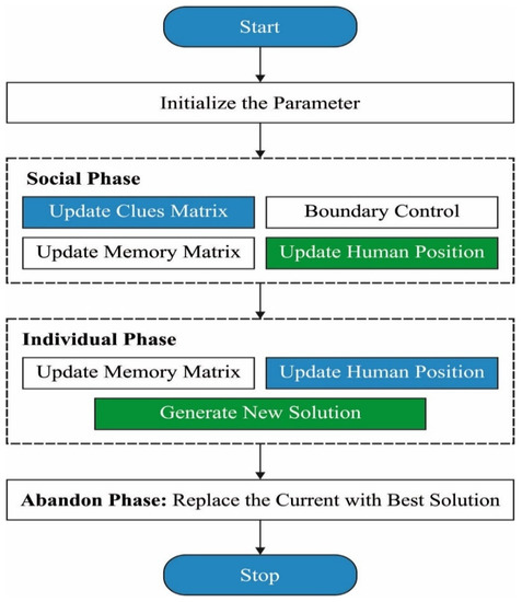 where denotes the position of variable j and the clue , and represent three uniform random numbers within , and , respectively. The second stage is about the individual. Here, an exploitation term has been performed regarding the human’s current location [65,66,67,68]. This stage employs the distinct clues connection concept from the social stage. The position, upgraded by the human, , can be attained as follows: