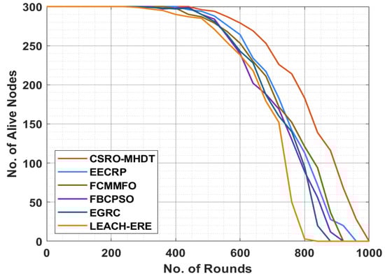 This section analyzes the CSRO-MHDT method in comparison with recent methods of effective data transmission processes in a UWSN. The consequences are reviewed under variable rounds of execution. Table 2 and Figure 3 demonstrate an examination of the comparative number of alive nodes (NAN) of the CSRO-MHDT technique under varying rounds. The results indicated that the CSRO-MHDT technique has increased values of NAN under all rounds. For instance, with 440 rounds, the CSRO-MHDT technique has obtained a higher NAN of 300, whereas the energy-efficient clustering routing protocol (EECRP), the fuzzy C-means and moth–flame optimization (FCMMFO), the fuzzy scheme and particle swarm optimization (FBCPSO), the energy-efficient grid routing based on 3D cubes (EGRC), and the low-energy adaptive clustering hierarchy based on expected residual energy (LEACH-ERE) models have attained lower NAN results of 296, 290, 299, 298, and 287 nodes, respectively. In addition, with 600 rounds, the CSRO-MHDT technique has an increased NAN result of 279, whereas the EECRP, FCMMFO, FBCPSO, EGRC, and LEACH-ERE models have lower NAN results of 264, 253, 240, 243, and 238 nodes, respectively. Moreover, with 920 rounds, the CSRO-MHDT technique accomplished a higher NAN result of 68, whereas the EECRP, FCMMFO, FBCPSO, EGRC, and LEACH-ERE models demonstrated lower NAN results of 20, 0, 0, 0, and 0 nodes, respectively.