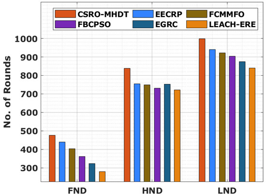 First node dies (FND), half node dies (HND), and last node dies (LND) are examples of the comparative network area evaluation of the CSRO-MHDT technique, as shown in Table 3 and Figure 4, respectively (LND). The results indicated that the CSRO-MHDT technique has resulted in lengthened lifetime over the existing methods. With respect to FND, the CSRO-MHDT method reached FND at 476 rounds, whereas the EECRP, FCMMFO, FBCPSO, EGRC, and LEACH-ERE models attained FND at earlier rounds of 440, 403, 361, 323, and 280, respectively. In addition, in terms of HND, the CSRO-MHDT system reached HND at 838 rounds, whereas the EECRP, FCMMFO, FBCPSO, EGRC, and LEACH-ERE techniques reached HND at earlier rounds of 754, 749, 730, 753, and 722, respectively. Finally, with respect to LND, the CSRO-MHDT approach reached LND at 998 rounds, whereas the EECRP, FCMMFO, FBCPSO, EGRC, and LEACH-ERE techniques reached LND at earlier rounds of 940, 921, 903, 874, and 840, respectively.
