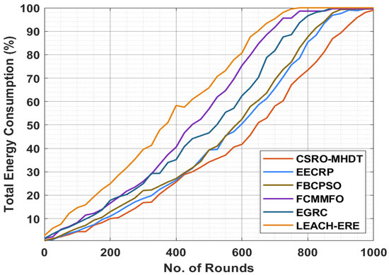 Next, a brief TEC investigation of the CSRO-MHDT method in comparison with existing approaches is provided in Table 4 and Figure 5. The results indicated that the CSRO-MHDT technique had the lowest TEC under all rounds compared with existing methods. For example, with 50 rounds, the CSRO-MHDT method obtained lower TEC of 2.22%, whereas the EECRP, FCMMFO, FBCPSO, EGRC, and LEACH-ERE models achieved higher TEC of 2.46%, 2.71%, 5.39%, 5.15%, and 7.59%, respectively. With 500 rounds, the CSRO-MHDT system had the lowest TEC of 34.16%, whereas the EECRP, FCMMFO, FBCPSO, EGRC, and LEACH-ERE models achieved higher TEC of 39.29%, 39.29%, 56.84%, 46.60%, and 65.87%, respectively. Finally, with 1000 rounds, the CSRO-MHDT technique had the lowest TEC of 99%, whereas the EECRP, FCMMFO, FBCPSO, EGRC, and LEACH-ERE methodologies attained higher TEC of 99.55%, 99.52%, 99.61%, 100%, and 100%, respectively.