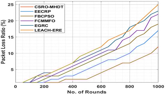 A detailed PLR analysis of the CSRO-MHDT approach in comparison with recent methods is offered in Table 5 and Figure 6. The outcomes showed that the CSRO-MHDT technique had the lowest PLR under all rounds compared with existing approaches. For instance, with 50 rounds, the CSRO-MHDT algorithm had decreased PLR of 1%, whereas the EECRP, FCMMFO, FBCPSO, EGRC, and LEACH-ERE systems obtained higher PLR of 1%, 1%, 1%, 1%, and 1%, respectively. Next, with 500 rounds, the CSRO-MHDT technique had a low PLR of 2%, whereas the EECRP, FCMMFO, FBCPSO, EGRC, and LEACH-ERE models had higher PLR results of 5%, 7%, 8%, 9%, and 10%, respectively. Finally, with 1000 rounds, the CSRO-MHDT technique had a low PLR of 12%, whereas the EECRP, FCMMFO, FBCPSO, EGRC, and LEACH-ERE models had increased PLR of 17%, 19%, 22%, 23%, and 25%, respectively.