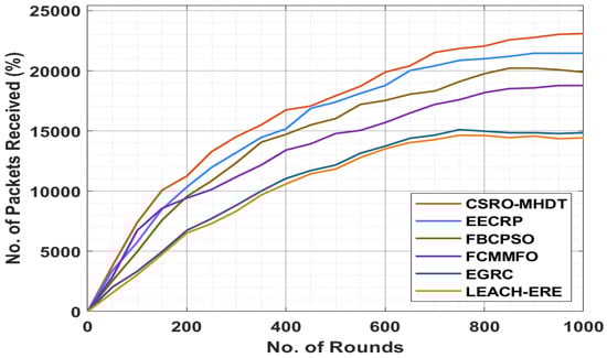 Table 6 and Figure 7 illustrate the number of packets received (NPR) by the CSRO-MHDT system under varying rounds, in comparison with existing approaches. The results showed that the CSRO-MHDT technique had higher values of NPR under all rounds. For instance, with 50 rounds, the CSRO-MHDT technique attained higher NPR of 3792%, whereas the EECRP, FCMMFO, FBCPSO, EGRC, and LEACH-ERE approaches had lower NPR results of 3400%, 2549%, 2876%, 2026%, and 1554%, respectively. With 500 rounds, the CSRO-MHDT method had higher NPR of 17,924%, whereas the EECRP, FCMMFO, FBCPSO, EGRC, and LEACH-ERE models had lower NPR results of 17,401%, 16,027%, 14,784%, 12,167%, and 11,837%, respectively. Furthermore, with 1000 rounds, the CSRO-MHDT system accomplished a higher NPR result of 23,098%, whereas the EECRP, FCMMFO, FBCPSO, EGRC, and LEACH-ERE algorithms demonstrated lower NPR results of 21,457%, 19,887%, 18,775%, 14,849%, and 14,427%, respectively.