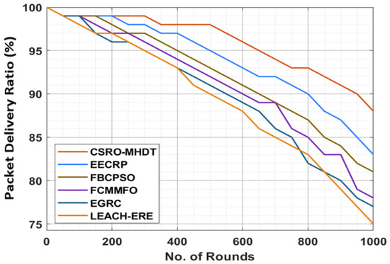 Table 7 and Figure 8 depict the PDR analysis of the CSRO-MHDT algorithm under varying rounds in comparison with existing approaches. The outcomes revealed that the CSRO-MHDT technique resulted in increased values of PDR under all rounds. For instance, with 150 rounds, the CSRO-MHDT technique attained superior PDR of 99%, whereas the EECRP, FCMMFO, FBCPSO, EGRC, and LEACH-ERE models reached lower PDR results of 99%, 99%, 98%, 97%, and 97%, respectively. Moreover, with 500 rounds, the CSRO-MHDT approach had an increased PDR of 98%, whereas the EECRP, FCMMFO, FBCPSO, EGRC, and LEACH-ERE models obtained lower PDR results of 95%, 93%, 92%, 91%, and 90%, respectively. Finally, with 1000 rounds, the CSRO-MHDT technique accomplished a higher PDR of 88%, whereas the EECRP, FCMMFO, FBCPSO, EGRC, and LEACH-ERE techniques exhibited reduced PDR of 83%, 81%, 78%, 77%, and 75%, respectively.