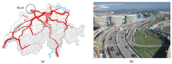 Figure 1a shows the relative traffic volumes on the motorway network in Switzerland. The border crossing to Germany represents an area of very high volume. In Basel, the traffic is routed over the border bridge,