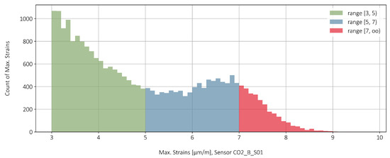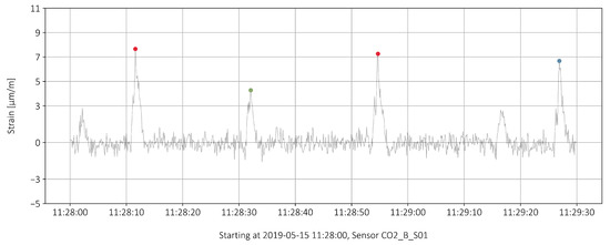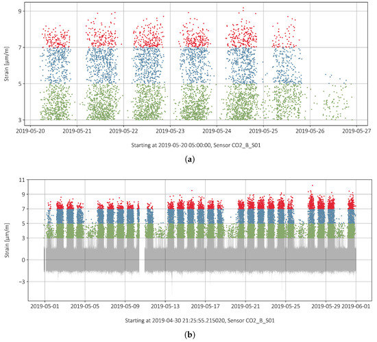 Figure 9a,b show the strain peaks for one week and the entire month. The colors correspond to the three categories defined in