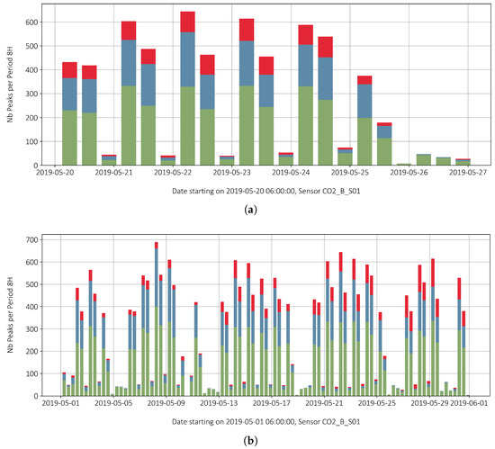 Figure 10b gives an overview of the entire month of May, the first day being a Wednesday. Weeks without public holidays have similar amounts of stain peaks. Therefore, the week shown in