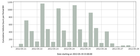 Figure 12 shows the heavy goods traffic on the bridge for the fourth week of May 2012. This picture shows the traffic occurrence of both lanes, regardless of vehicle weight, because only the axle distance is measured. The traffic pattern is very similar and the numbers match rather well. A moderate increase in traffic will most likely continue.