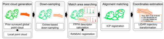 The global localization method for an underground mine follows five steps. Figure 1 is a schematic diagram that describes the global localization procedure. First, mobile LiDAR is used to generate a global cloud map of the entire underground mine and transform the coordinates to the Universal Transverse Mercator (UTM) coordinate system in meters. A local point cloud with a range of ≥10 m is generated using the mobile LiDAR in an area that requires location recognition. Second, to increase the point cloud processing efficiency, the resolution of the global point cloud and local point cloud is reduced through octree-based subsampling. Third, through feature-based coarse registration, the matching area between the global and the local point clouds is searched and the transformation matrix is calculated. In this step, the correspondences between the global and local point clouds are iteratively searched using the RANSAC technique. Fourth, the alignment between the global and local point clouds is precisely matched using the ICP algorithm. Fifth, the position coordinates of the object are estimated from the LiDAR sensor trajectory.