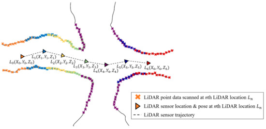 The pose and location of the LiDAR sensor can be estimated by calculating the relative transformation between correspondence points. Equation (1) is the equation used for calculating the LiDAR sensor location [30]. Here, Lτ denotes the three-dimensional position coordinates of the LiDAR sensor at time τ; ΔTτ−1,τ denotes the relative transformation according to the time change (from τ −1 to τ). The relative transformation consists of a rotation matrix and a translation matrix. Figure 2 is a schematic that explains the principle of forming a point cloud map through continuous scan matching and estimation of the LiDAR sensor trajectory.