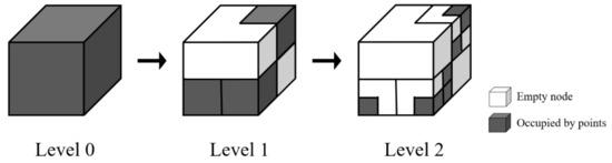 To increase the operating speed and efficiency of the global localization, the resolution of the global and local point clouds is lowered. For down-sampling, an octree structure-based subdivision method is applied [39]. The octree method is one of the methods used for indexing 3D point cloud data. The octree node exists in the form of a rectangular cuboid and is subdivided into eight children. No further subdivision is necessary when the octree node is not occupied by points. Figure 3 describes the subdivision method based on the octree structure. The octree level represents the number of subdivisions. Octree level 1 constitutes the division of the entire point cloud data area by eight octree nodes, while octree level 2 constitutes the division of the occupied octree nodes (gray volumetric cubic area in Figure 3) by the eight children. The octree structure is suitable for effective storage and retrieval of point cloud data that are not fully volumetric.