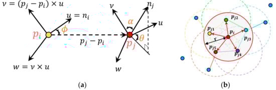 - Computation of angular variations in the surface normal: Angular variations in the surface normal are calculated for the k-nearest neighbors of point p. The point pi and its nearest neighbor pj are defined in the Darboux uνw frame (u = ni, v = (pi − pj) × u, w = u × v. Figure 4a depicts the points pi and pj in the Darboux frame. The angular variation (α, ϕ, θ) for all nearest neighbors is calculated as shown in Equations (3)–(5). The computational complexity is O(k).