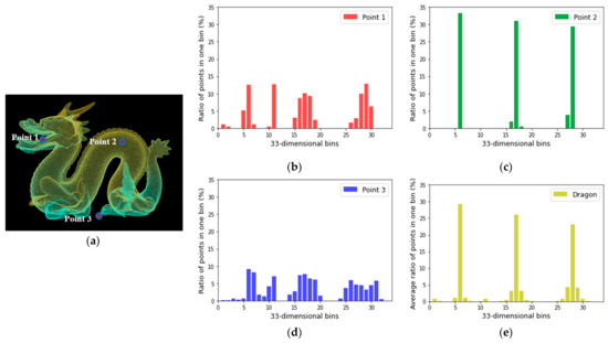 Figure 5 shows the FPFH descriptors with 33-dimensional bins calculated for any three points (point 1: mouth, point 2: body, point 3: foot) of the dragon point cloud dataset and the average FPFH descriptor calculated for all points. In Figure 5b, the x-axis shows that all SPFH values calculated for point 1 and its k-nearest neighbors are expressed as 33 bins. The y-axis represents the ratio of the number of points included in one bin. The FPFH descriptor is calculated according to the geometric characteristics of the point.