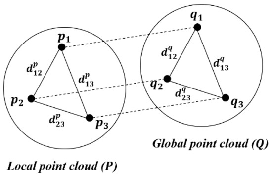 Figure 6. Graphical diagram of relative dissimilarity vector computation when including three corresponding points {(p1, q1), (p2, q2), (p3, q3)}. - Transformation matrix update using RANSAC: A temporary transformation matrix between the correspondence points (pi, qi) is calculated, and the down-sampled local point cloud () is transformed to the global point cloud (). Euclidean distances of the nearest neighbors between and are calculated; only k point pairs are extracted as inlier points (pk, qk) whose Euclidean distance is lower than the Euclidean distance threshold (εdistance). Equation (8) is the calculation of a required iteration number N of RANSAC; p denotes the desired success probability, w denotes an expected inlier fraction, and n constitutes the number of sample points. Model fitting and inlier point update continue until an optimal transformation matrix that minimizes the sum of the squared distances between the inlier points is obtained or the maximum iteration number Nmax is reached. The initial local point cloud moves to the match area (Pinit→PRANSAC) by transforming the coordinates using the rotation matrix (RRANSAC) and the movement matrix (tRANSAC) (Equation (9)).