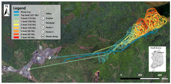 The study area comprised the Gwan-in underground mine (38°07′00″ N, 127°13′24″ E), which is located in Gwanin-myeon, Pocheon-si, Gyeonggi-do, Korea. Figure 7 shows an aerial photograph of the study area. The underground mine produces 280,000 tons of iron ore annually via sublevel stoping. The slope of the rampway is approximately 6° to 8°; the width and height of the tunnel are approximately 4.5 m. Iron ore is produced in the 3rd, 5th, 6th, and 7th level drifts.