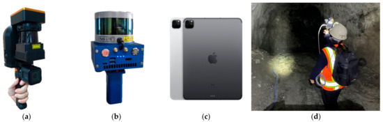Global and local point clouds of the study area were generated using mobile LiDAR. The mobile LiDAR used in the experiment was GeoSLAM’s ZEB-REVO, A.M. Autonomy’s MAPTORCH, and Apple’s iPad Pro. Three LiDAR systems were used in the field experiment for evaluation of the registration accuracy between point clouds formed from different LiDAR products. The iPad Pro LiDAR was used for the experiment because of its suitability for use in underground mining sites (low cost, light weight, and ease of carrying) in comparison to the other commercialized LiDAR systems. Furthermore, the iPad Pro can be used for data collection, data transmission and reception, and communication between workers in underground mines. Figure 8 shows the appearance of each device and the scene of LiDAR scanning in the study area.