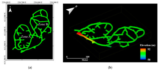 A global point cloud was developed for the 6th level drift using the ZEB-REVO. Figure 9 shows the global point cloud of this drift. The 6th level drift is divided into zones A and B according to the ore body distribution; the average elevation of the bottom surface is 65 m above mean sea level. The total number of points in the global point cloud was 9.2 × 107, and the average surface density was 3516 pts/m2. The global point cloud was converted into the Korea 2000 Korea Central Belt 2010 TM coordinate system using 10 ground control points of the 6th level drift.
