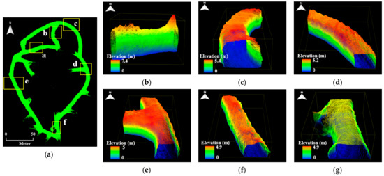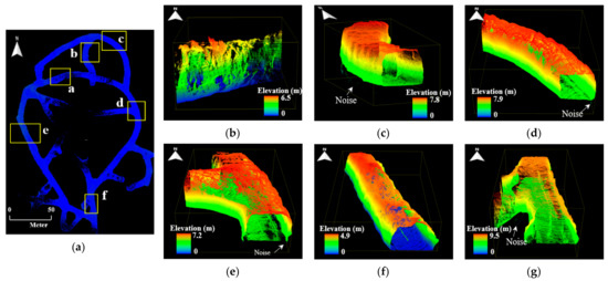 Local point cloud datasets generated using ZEB-REVO: (a) point cloud map of zone B of 6th level drift; (b) section a; (c) section b; (d) section c; (e) section d; (f) section e; (g) section f.