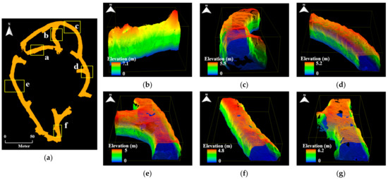 Local point cloud datasets generated using MAPTORCH: (a) point cloud map of zone B of 6th level drift; (b) section a; (c) section b; (d) section c; (e) section d; (f) section e; (g) section f.