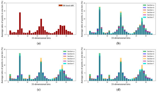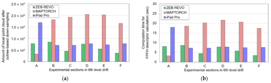 Figure 13 illustrates the amount of the local point cloud datasets and the computation time required to calculate the FPFH descriptor for each section. The computation time of the FPFH descriptor increased as the amount of the point cloud increased. Figure 14a shows the average FPFH descriptor calculated for the global point cloud down-sampled to a voxel size of 0.5 m. Figure 14b–d show the average FPFH descriptor of the local point cloud datasets (sections a–f) obtained from three mobile LiDAR systems. The average FPFH descriptors for each section showed an almost identical histogram form, irrespective of the type of LiDAR. Moreover, they showed a form similar to the form of the average FPFH descriptor of the global point cloud.