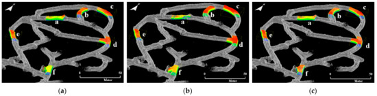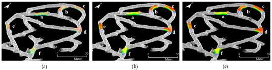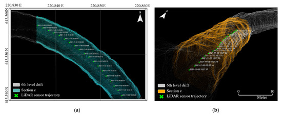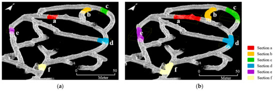 Figure 15 is the result of matching the global point cloud and local point cloud datasets through the RANSAC and ICP registration algorithms. All local point cloud datasets are exactly aligned to sections a–f in zone B of the 6th level drift. Irrespective of the type of mobile LiDAR system, it was possible to accurately identify the match area between the global point cloud and the local point cloud datasets.