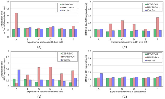 Figure 16 illustrates the computation time and accuracy of RANSAC and ICP registration. An average interval of approximately 3.71 s was needed for RANSAC registration in the local point cloud datasets, except for section a generated by MAPTORCH. The high computation time of approximately 10 s in section a was caused by the low precision of the local point cloud, as shown in Figure 11b; many iterations were required for algorithm convergence.