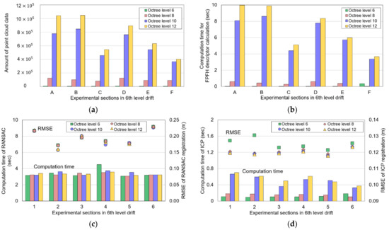 The sensitivity of RANSAC and ICP registration to the variation in local point cloud resolution was analyzed. The local point cloud datasets (sections a–f) of ZEB-REVO were down-sampled by setting the octree level to values of 6, 8, or 12. The global point cloud was down-sampled by setting the octree level to 10. The drift length of the local point cloud datasets was set to 20 m. The parameters used for the algorithms were identical to the parameters in Table 3.