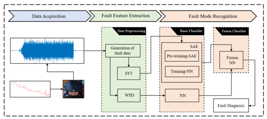 Vibrations generated by the running shield will cause the measurement of FOG to be out of calibration or invalid [25]. Although many intelligent methods have obtained exciting results in FOG fault diagnosis, most of them collect or generate fault data under ideal conditions, and do not take into account the influence of vibration. Signal interference caused by random vibrations of various frequencies during construction [26,27] will combine the fault signal features of the fiber optic gyroscope with the vibration signal features, further reducing the extraction ability of the fault features, thereby decreasing the diagnosis accuracy [28]. To solve this problem, a new fusion fault diagnosis method for FOG is proposed in this paper, according to the outstanding contribution of neural networks in fault diagnosis. Firstly, two feature extraction methods, FFT and WPD, are adopted in this paper to extract fault features. Secondly, two classifiers with high diagnostic accuracy, FFT-based SAE and WPD-based NN, are established. Finally, a fusion fault diagnosis network is constructed with the output of the basic classifier as the feature vector. The fusion model proposed is compared with other fault diagnosis methods, including BP, SVM, CNN, and random forest (RF), etc., to verify the effectiveness of the fusion model. The contributions of this paper can be summarized as follows: