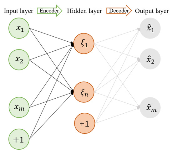 The auto encoder is a system that reduces the dimensionality of its input. The auto encoder consists of an encoder and a decoder part, as shown in Figure 2. The main purpose of the auto encoder is to transform the input from a high-dimensional space into a low-dimensional feature space to obtain the intermediate variable ξ. Then, is reconstructed from the feature space into an . Then the difference between and is minimized. When the dimensionality of the intermediate variable (the node numbers in the hidden layer) is smaller than the dimensionality of the input (the node numbers in the input layer), the intermediate variable can be regarded as the dimensionality reduction data, compressed with minimal information loss to the input data. Since no label information is utilized in the encoding and decoding process, it can be used in an unsupervised task. Many variants of the auto encoder, such as the denoising auto encoder [29], shrinking AE [30], and SAE [31,32], are created to better learn feature reformulation and avoid overfitting. A sparse auto encoder (SAE) is actually a sparse constraint added to the encoding to penalize the activation output values of the hidden layer [33]. In an SAE, the hidden cell can be calculated by Equation (1), where is the activation function of Sigmoid and it will be close to zero, which means that most of the hidden layer is suppressed. The Kullback–Leibler (KL) divergence for measuring these deviations can be written as Equation (2):